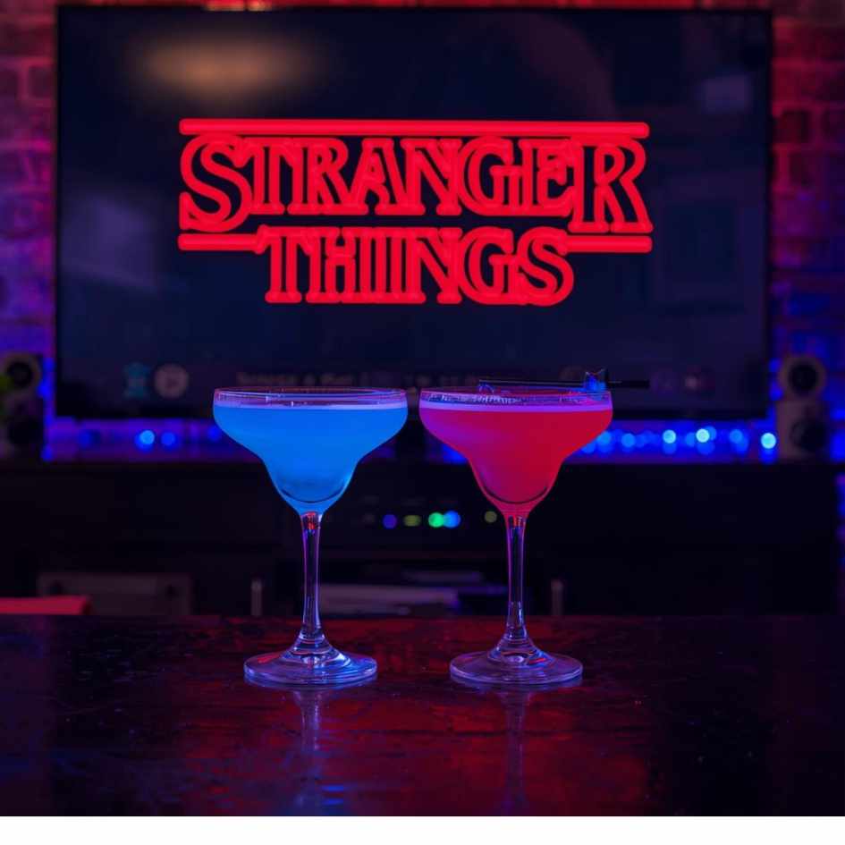 Prepara cócteles o mocktails vibrantes con colores neón brillantes como azul eléctrico o rojo intenso que parecen sacados directamente del Upside Down. Ponles nombres creativos y temáticos como “Elixir de Eleven” o “Sangre del Demogorgon” para darle un toque extra de misterio y diversión a tu fiesta Stranger Things. ¡Salud por Hawkins y sus secretos!